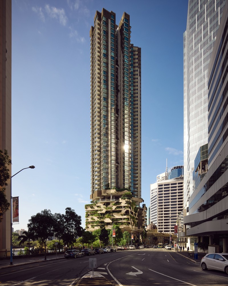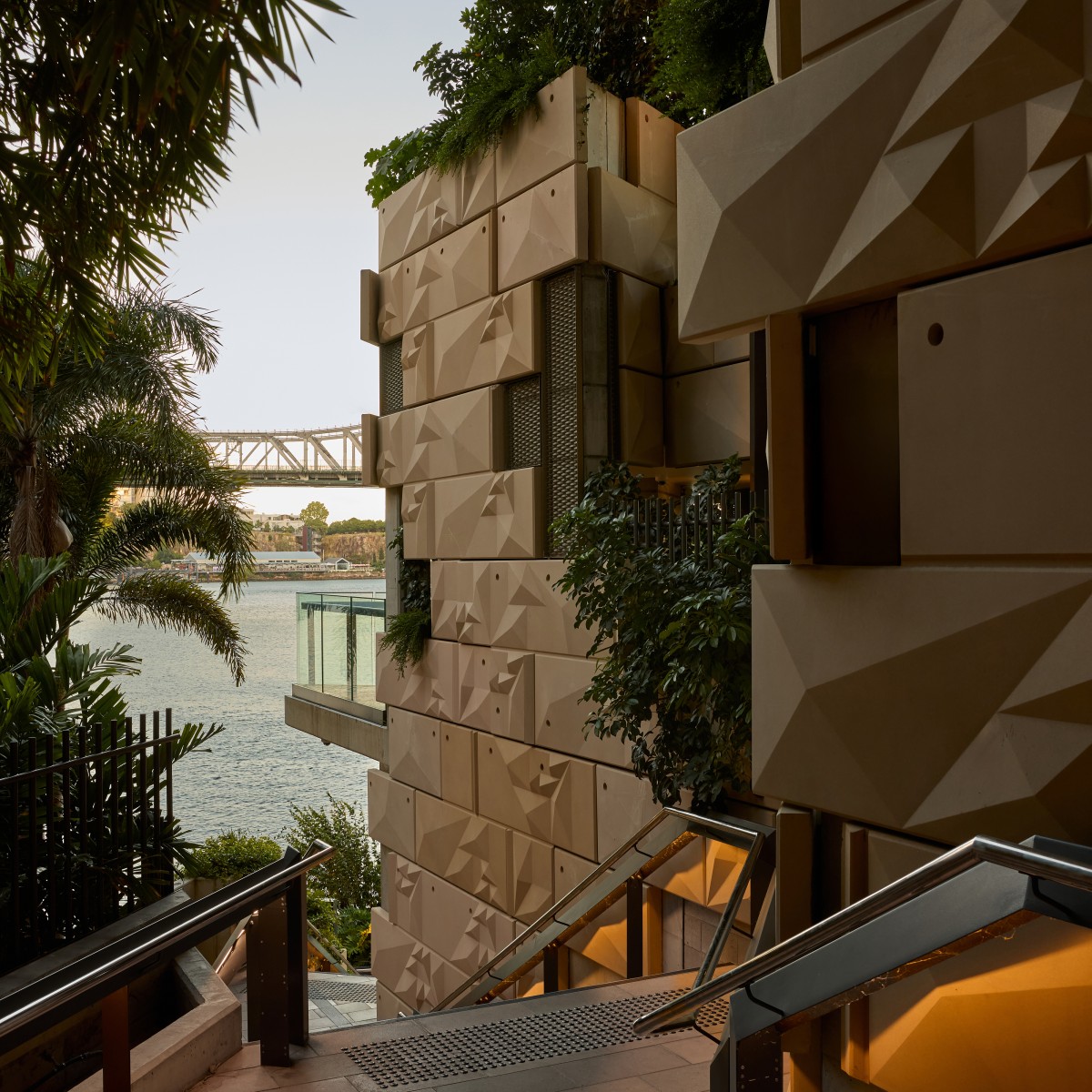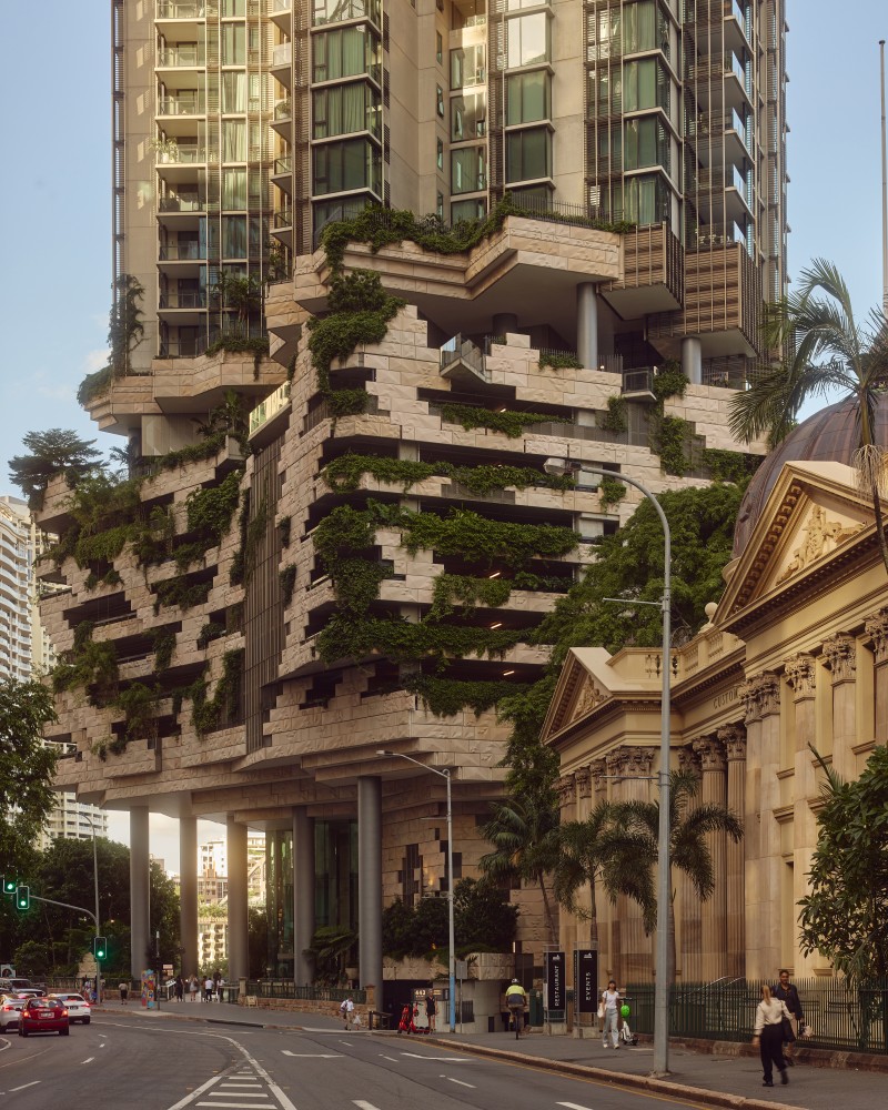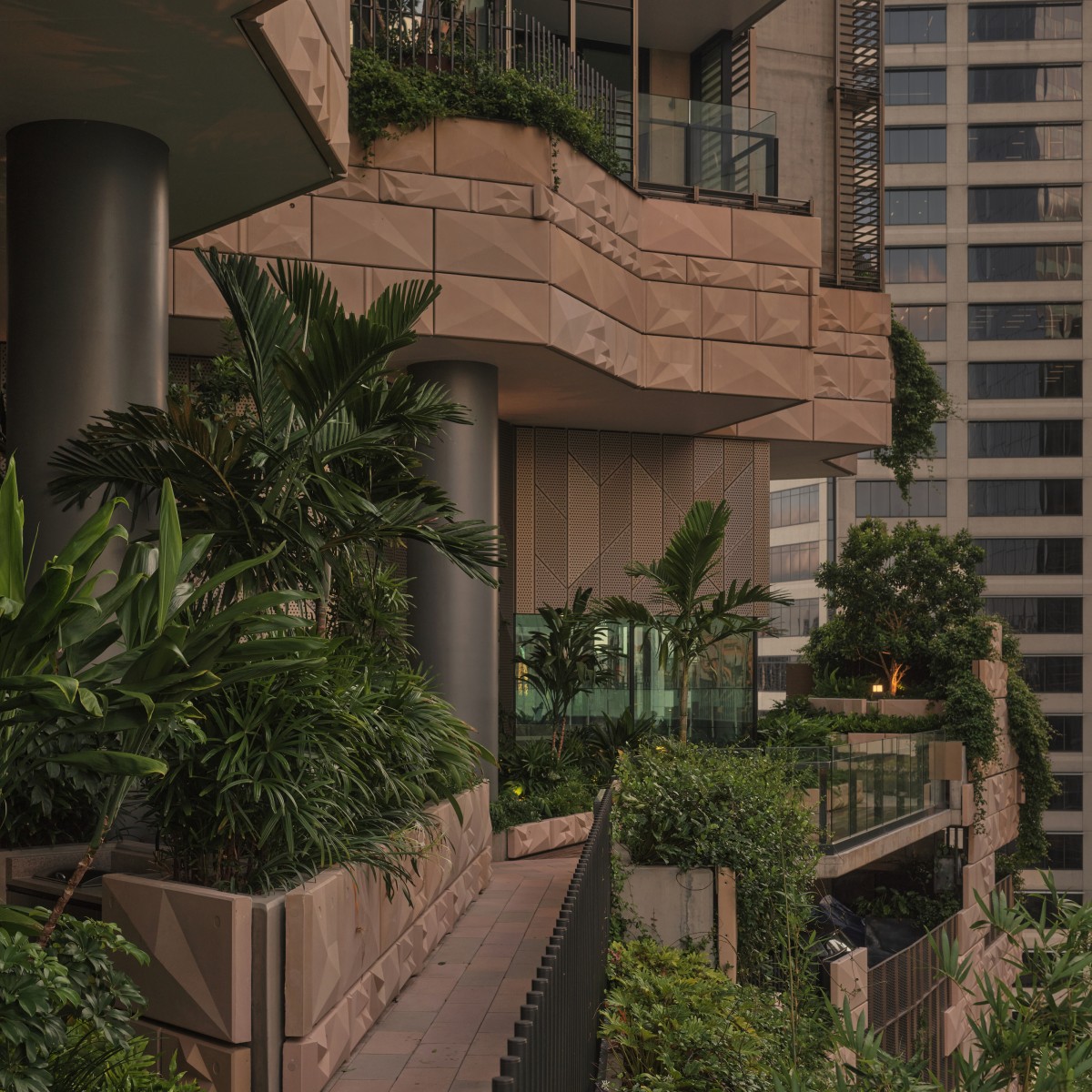 In collaboration with Woha Architects, vertical living is transformed into a subtropical experience, lush plantings and porosity in the building fabric afford an architecture that breathes. The layout fans apartments around a central open space, allowing air, light, and landscape to flow through. Each level acts as a garden terrace, offering glimpses of the Maiwar/Brisbane River through layers of lush tropical vegetation.