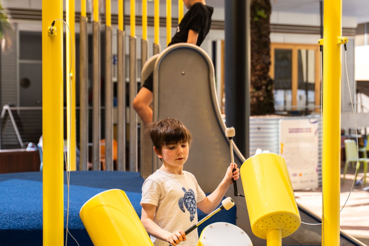 The playspace accomodates large wheelchairs, enabling those with limited mobility to participate alongside peers and families. Inclusive, interchangeable equipment, a heat-resistant slide, a wheelchair-accessible in-ground trampoline, merry-go-round and magnetic games provide varied options. Sensory play is embedded through large-scale xylophone and drums, offering sound, touch and visual experiences.