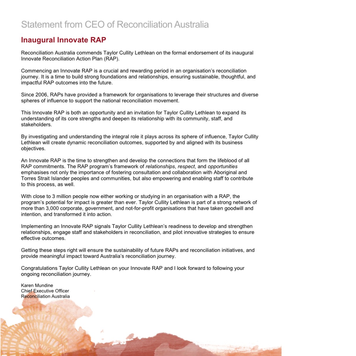 Taylor Cullity Lethlean as a business is developing a RAP to demonstrate our commitment to always work towards the recognition of Aboriginal and Torres Strait Islander cultures, histories, and learnings through our work and improving the working relationships between Aboriginal and Torres Strait Islander people and non-Indigenous people. This RAP was initiated to ensure our company is actively engaged in the process of Reconiliation, so we can be informed when we enter dialogue with our collaborators, clients, and the community at large.