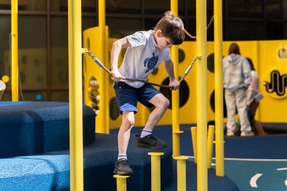 A bold blue and yellow palette animates the play deck, with blue on the ground plane creating a grounded base and yellow on play equipment signalling energy and discovery. The synthetic rubber surface, provides a soft, accessible base that is durable, easy to clean and hospital-appropriate. White visual markers on coloured pathways form a continuous running track, guiding children from one element to another and tying the space together. Rather than specifying how equipment should be used, the layout encourages imaginative play for children of different ages and abilities.