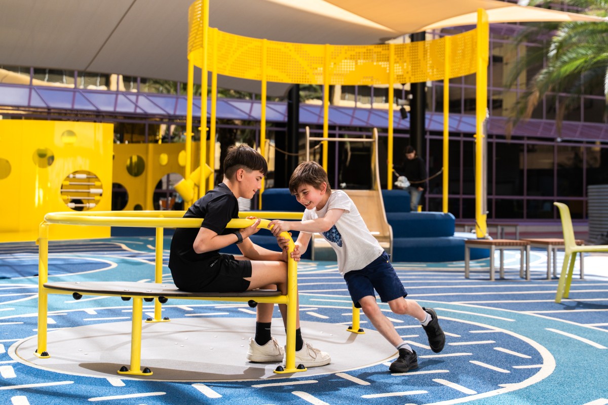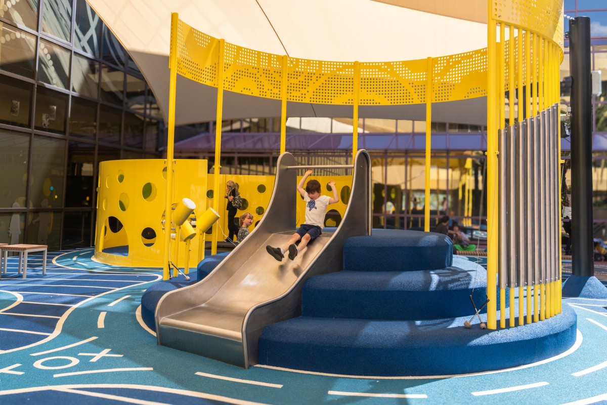 The playspace accomodates large wheelchairs, enabling those with limited mobility to participate alongside peers and families. Inclusive, interchangeable equipment, a heat-resistant slide, a wheelchair-accessible in-ground trampoline, merry-go-round and magnetic games provide varied options. Sensory play is embedded through large-scale xylophone and drums, offering sound, touch and visual experiences.