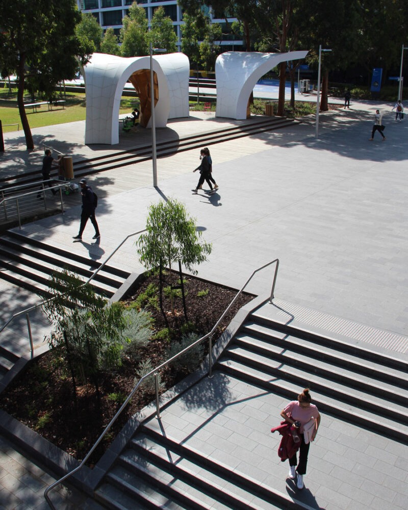Queens Walk is located at the heart of Monash University’s Caulfield Campus. As part of the implementation phase of the wider campus masterplan, the design for Queens Walk stitches the recently completed Campus Green to the refurbished library (by JWA) and Eastern Arts Precinct via a strong north-south pedestrian link.The design transforms an existing road into a social and dynamic space through its connection to a series of activity areas, such as cafes, outdoor workshops and retail outlets. This will provide clear legibility throughout the site and provide a fully integrated pedestrian network.A strong sense of arrival is created from Sir John Monash Drive with a wide, planted staircase that leads up to the heart of the campus.At the library forecourt an open plaza area allows for various circulation routes throughout the campus and also provides a great platform for pop-up activities and temporary events.In the north, two generous raised lawn areas connect with a line of lemon-scented gum trees (Corymbia citriodora), allowing passive recreation for students in the MADA building.A series of outdoor learning spaces along the avenue will provide further opportunities for students and staff to utilise the space for teaching and learning. By elevating the quality of open space on university grounds students are encouraged to study, play, socialise and relax on campus.